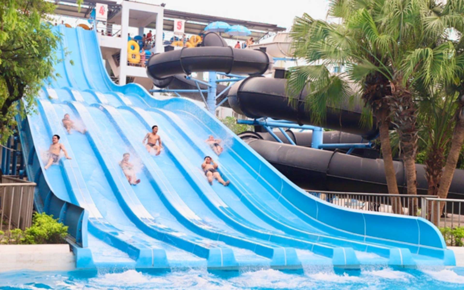 Hệ thống 7 làn đường trượt nước cảm giác mạnh, hai đường cao tốc cao 14,5m, cùng bể tạo sóng sâu 3m, sóng 1,2m – cho bạn cảm giác như đang ở biển thật.